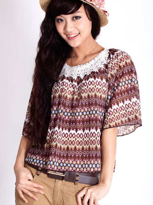 服装名称: 2012夏季新款领部蕾丝雪纺小衫批发