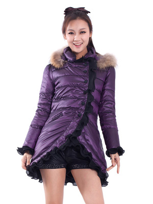 2012冬季新款羽绒服批发,西欧经典燕尾荷叶边貉子毛领羽绒服。修身加厚燕尾设计羽绒服,波浪荷叶边装饰门襟,袖口,彰显优雅与生动的婀娜身姿。内胆是欧洲T300出口标准的涂层防绒胆料,采用双层防绒,轻轻松松锁住羽绒,让毛毛一根都跑不了。