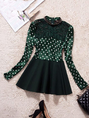描述:欧洲站2014春季新款女装 波点钉珠真丝拼接长袖修身连衣裙批发。