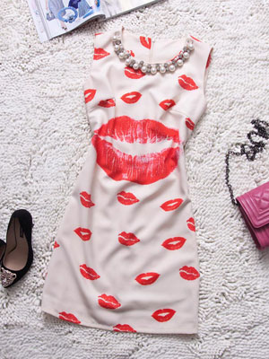 服装名称: 2014春季新款 烈焰唇印串珠链领无袖丝质修身连衣裙批发