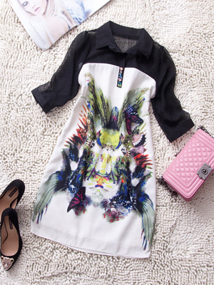 服装名称: 2014春夏新款 超高翻领镶钻蝴蝶晕染图案修身连衣裙批发