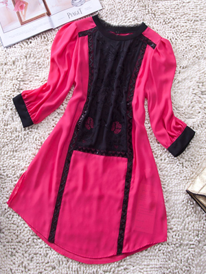 描述:2014春季新品 撞色拼接泡泡肩刺绣花朵连衣裙收腰连衣裙批发