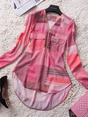 服装名称: 2014春季新品 韩版V领前短后长弧度下摆格子长袖薄款套头衬衫女批发