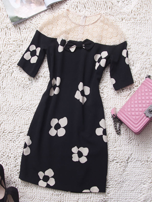 服装名称: 2014春夏新款女装 性感蕾丝肩短袖包臀裙 撞色印花收腰连衣裙批发