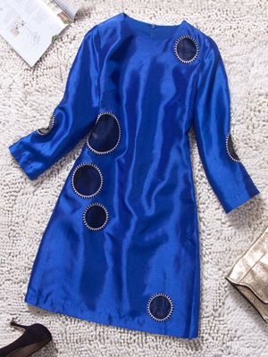 描述:2014春夏新品 韩版圆领真丝裙 精致圆圈七分袖连衣裙批发