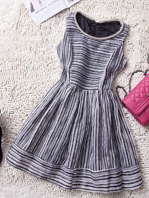 服装名称: 2014春夏新款女装 韩版镶钻链圆领无袖收腰大裙摆百褶横条连衣裙批发