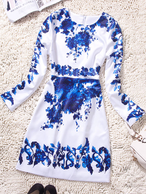 服装名称: 2014春季新款 欧洲站 青花瓷圆领印花花朵收腰裙收腰中场款连衣裙批发 女
