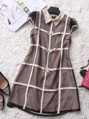 描述:2014夏季新款 女装韩版翻领格子连衣裙时尚纱网短袖打底裙