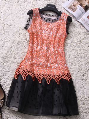 服装名称: 2014夏季新品女装 甜美镂空编织拼接纱网假两件背心连衣裙正品原单批发