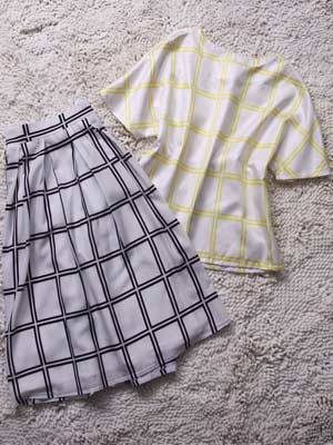 服装名称: 2014新款 外贸原单正品女装 韩版真丝格子T恤+黑白格子百褶裙套装批发