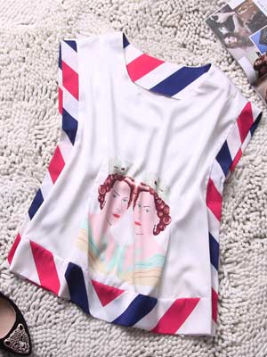 服装名称: 外贸原单 2014春夏新品绚丽条纹边人物头像无袖圆领T恤女装批发