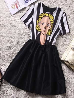 服装名称: 2014夏季新品女装 外贸原单动漫人物头像竖条拼接百褶收腰连衣裙批发