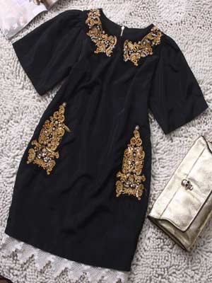 服装名称: 2014春夏新款欧洲站泡泡袖金色绣花钉珠连衣裙外贸真丝女装批发