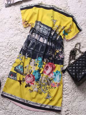 服装名称: 2014春夏新品 女装复古楼房印花一字领宽松真丝连衣裙外贸女装批发